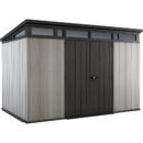 The Keter 11’x 7′ Artisan Heavy Duty Plastic Pent Shed – Grey is ideal for storing tall and heavy items due to its high ceilings and integrated heavy-duty resin floor. The Artisan 9×7 Shed includes built in high level windows that cover the front and sides of the building to provide natural light into the interior.